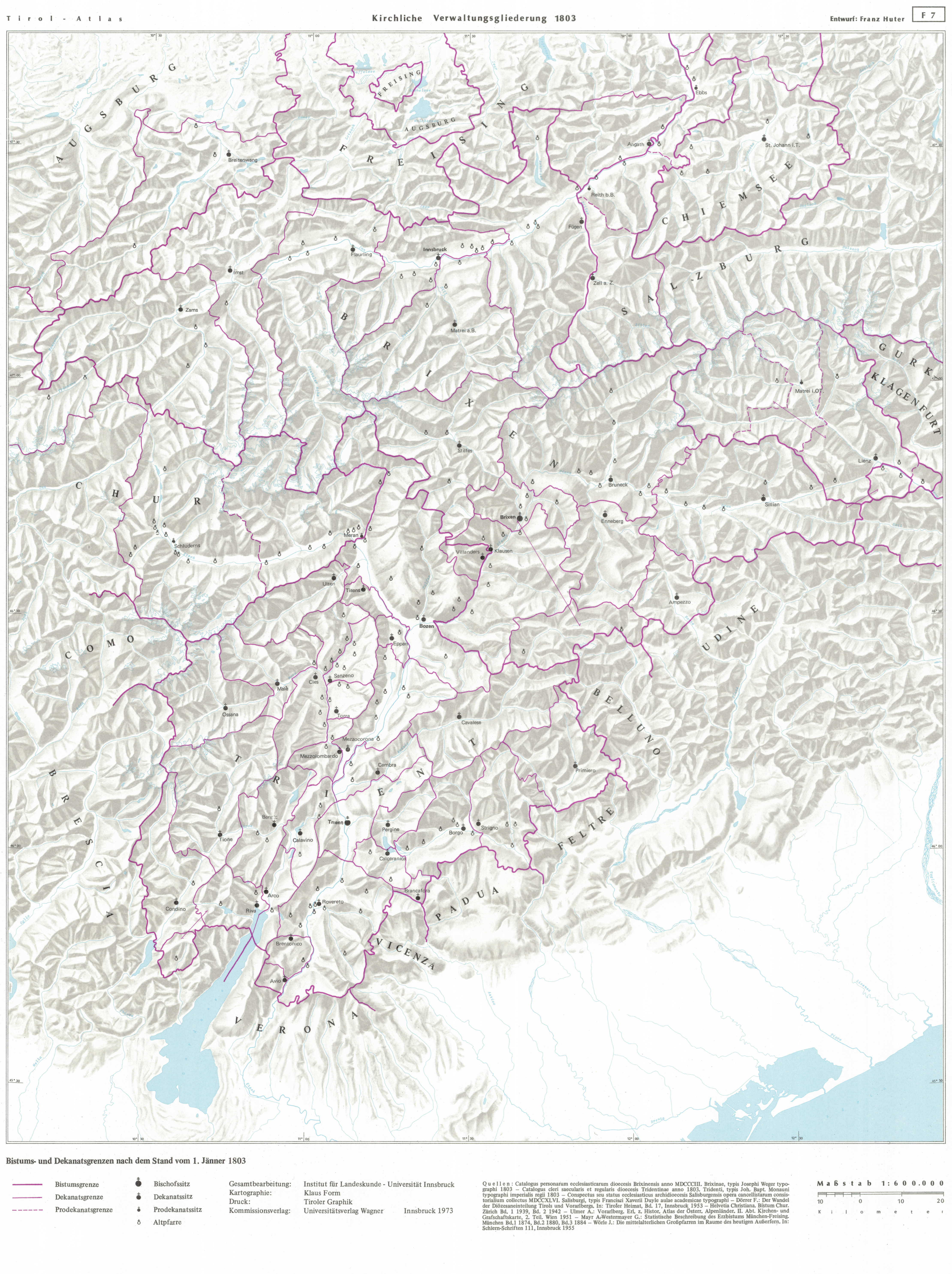 - Begleittext: Franz Huter: Kirchliche Verwaltungsgrenzen: Bistums- und Dekanatsgrenzen nach dem Stande 1. Jänner 1803. In: Tirol Atlas Begleittexte I, S.17-18, Innsbruck 1974.