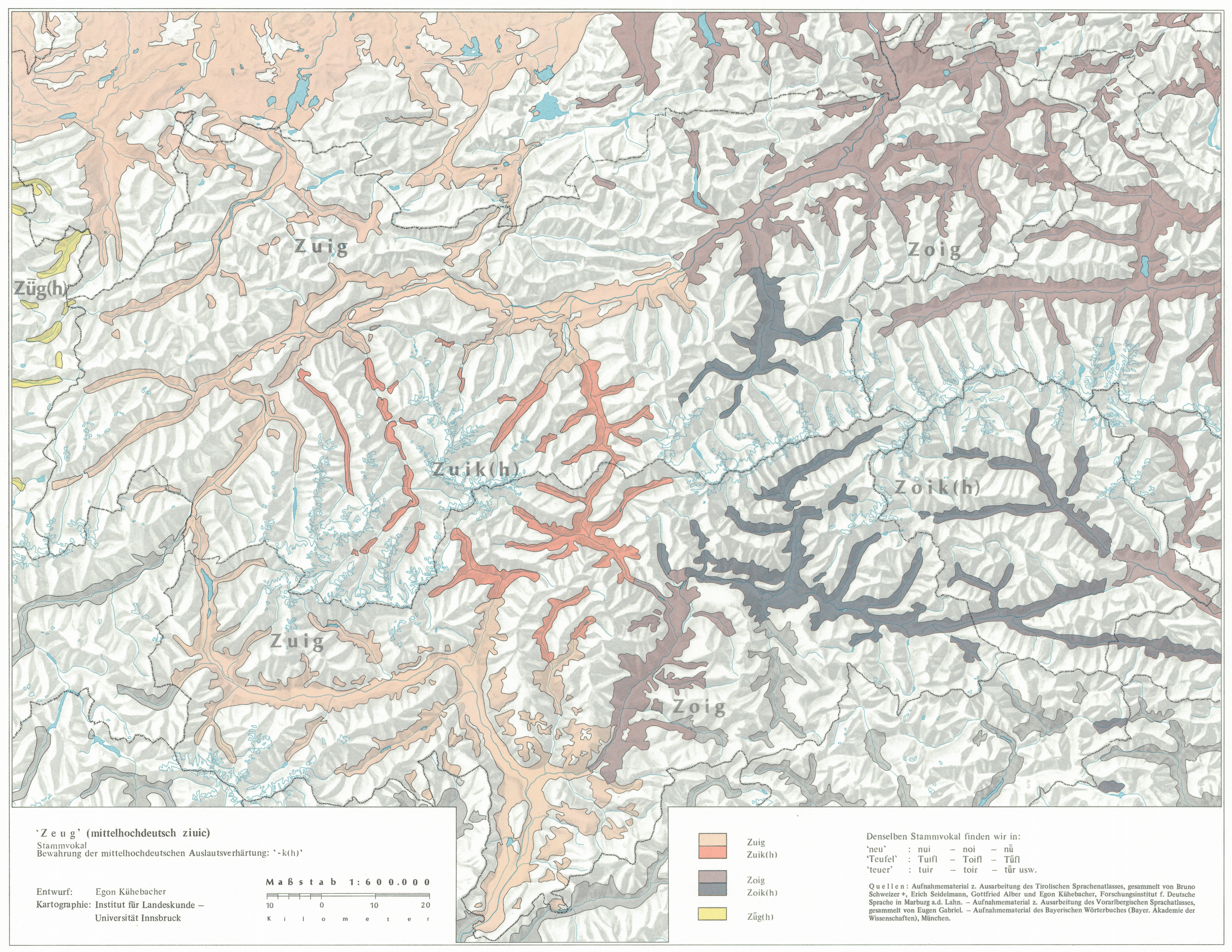 - Begleittext: Egon Kühebacher: Sprache und Dialekt. In: Tirol Atlas Begleittexte I, S.21-27, Innsbruck 1974.