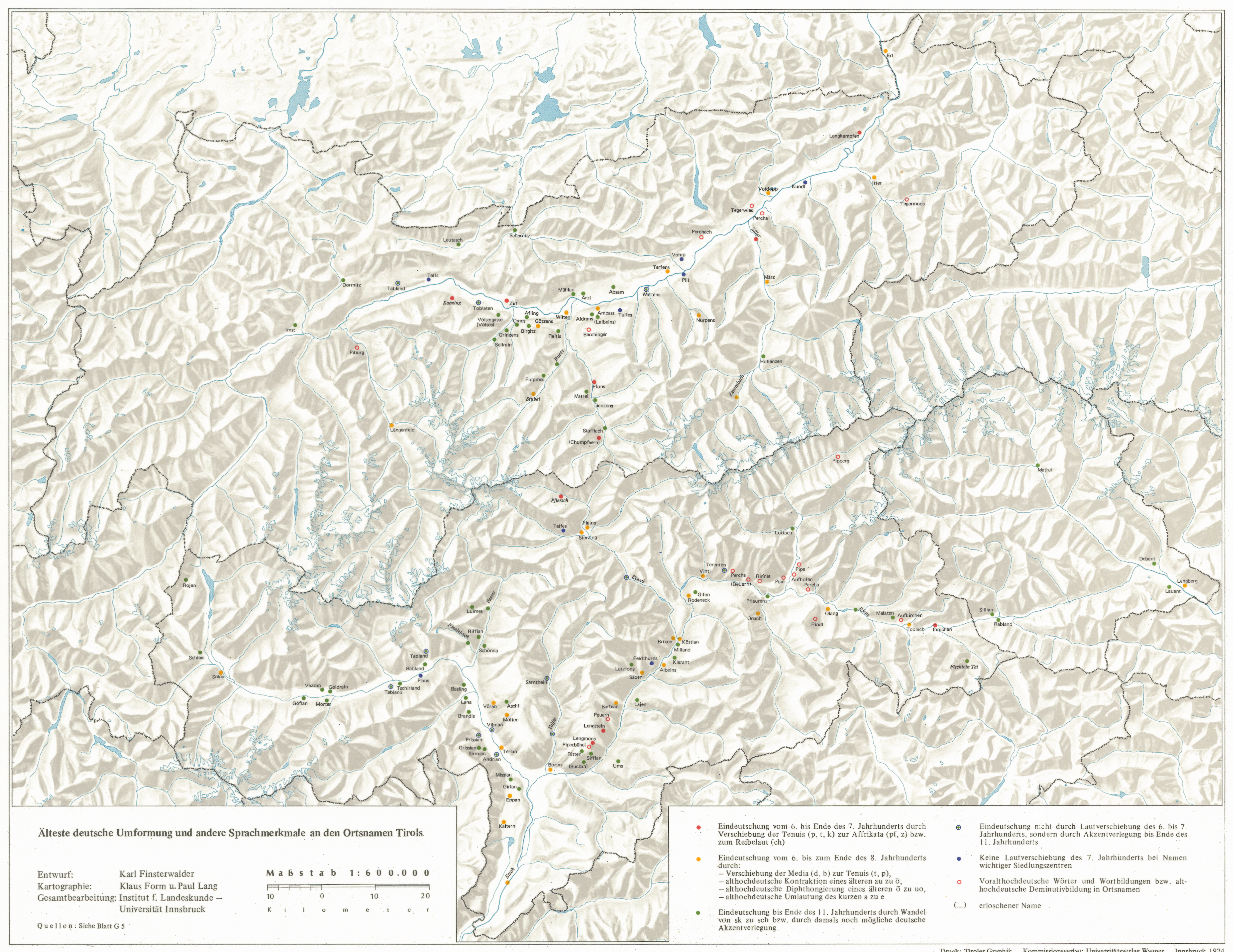 - Begleittext: Karl Finsterwalder: Die Ortsnamen in Tirol. In: Tirol Atlas Begleittexte II, S.28-37, Innsbruck 1975.