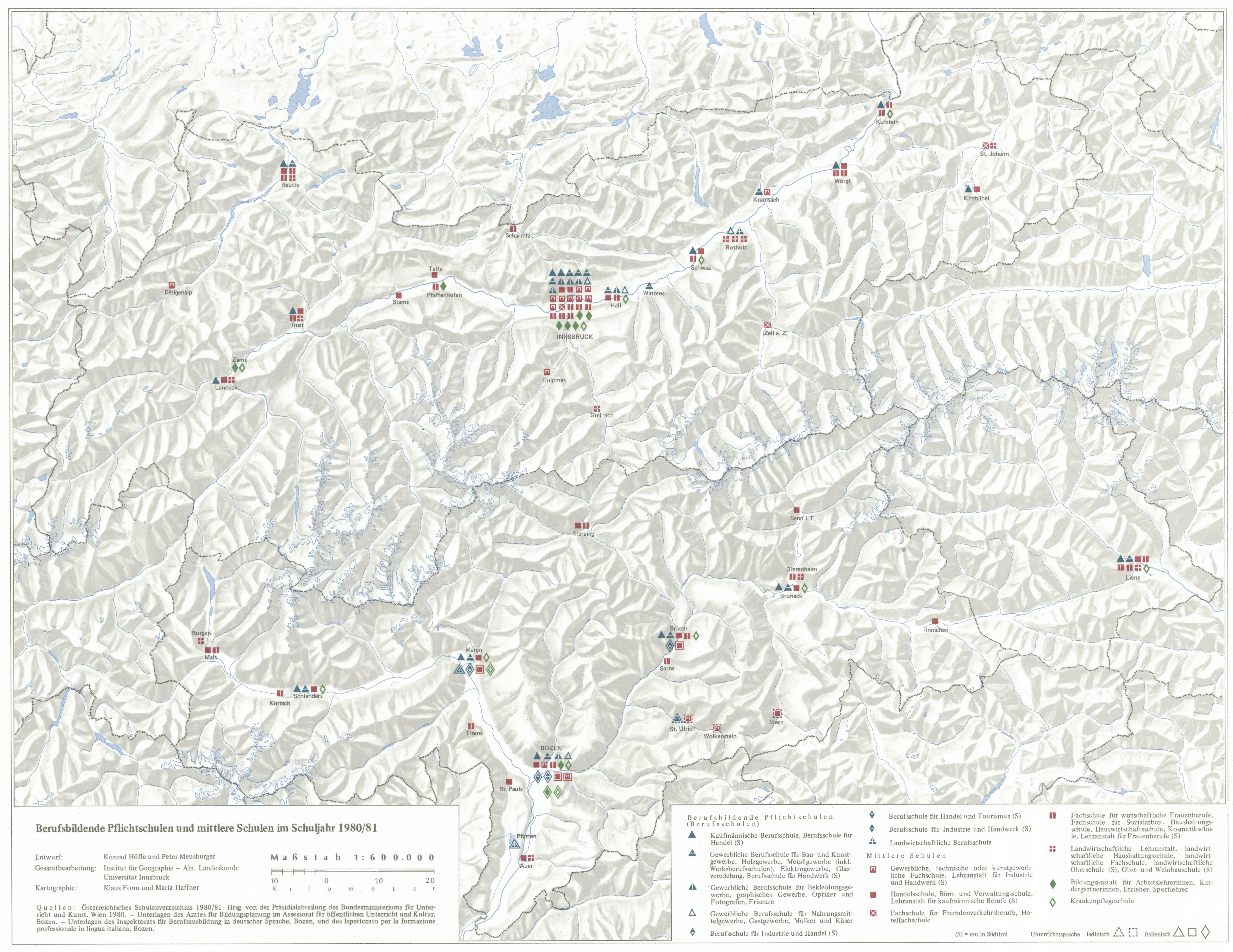 - Begleittext: Konrad Höfle, Peter Meusburger: Kindergärten und weiterführende Schulen. In: Tirol Atlas Begleittexte VIII, S.56-59, Innsbruck 1983.